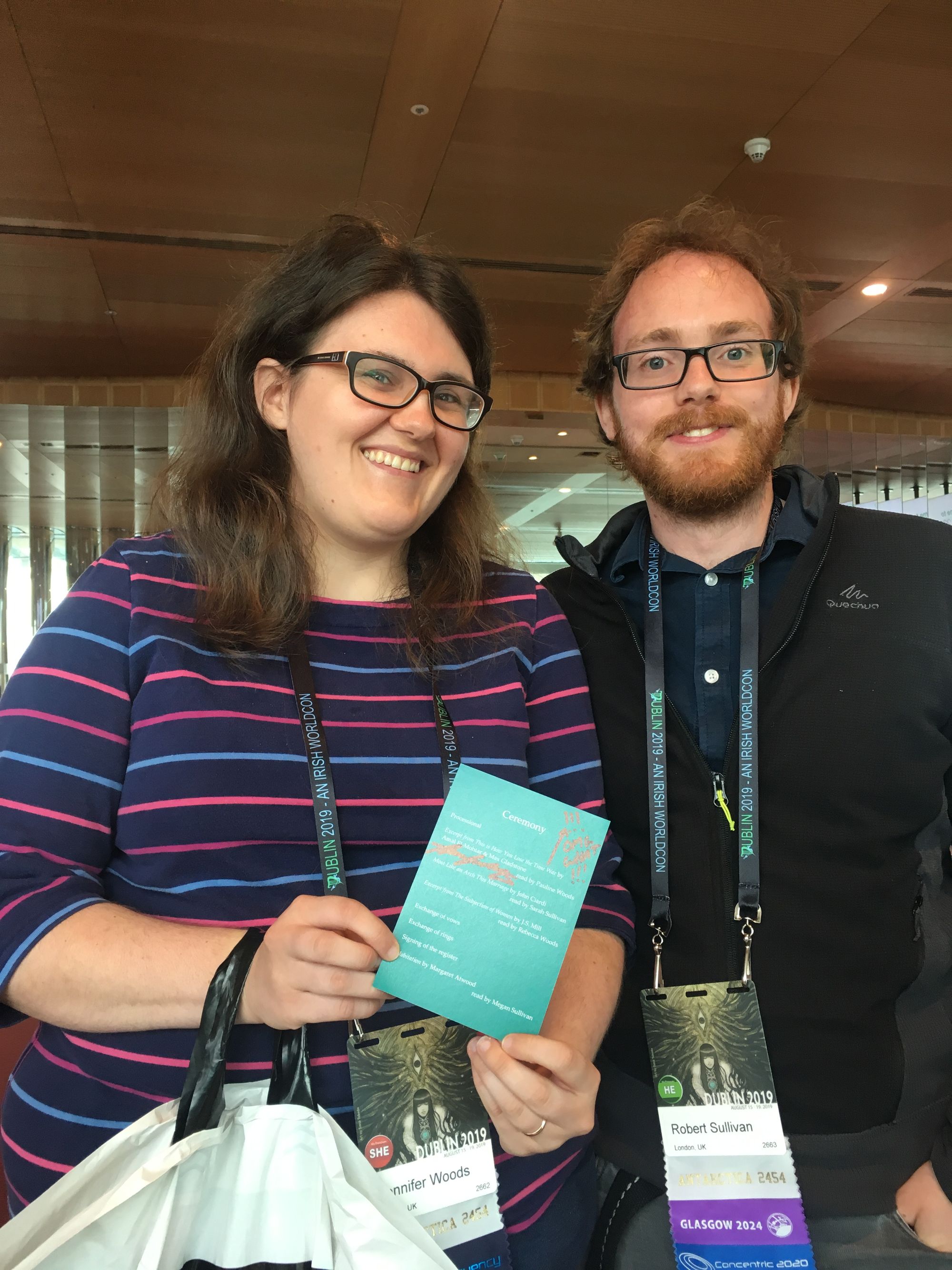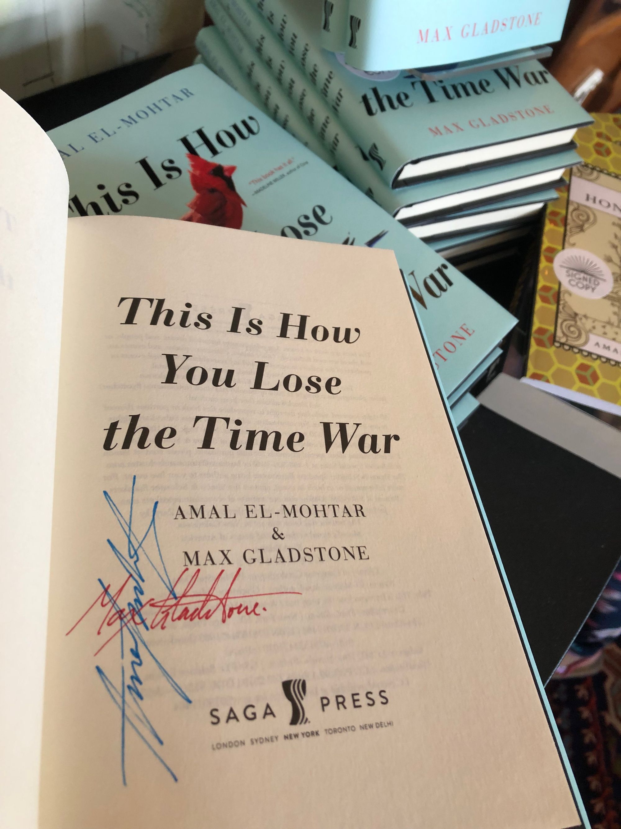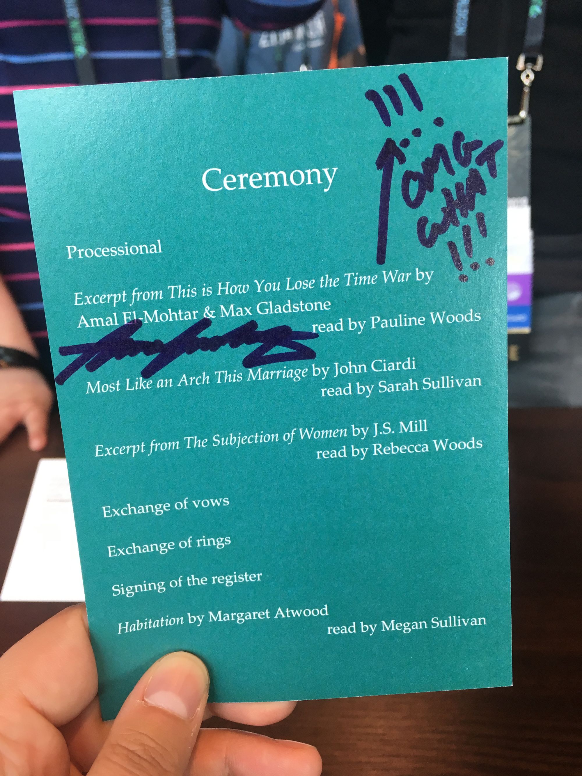 But I think possibly this is what did me in the most: a couple who came to my autograph session at Dublin Worldcon to ask me to sign, not a copy of the book, but of their freakin’ WEDDING PROGRAM—because they’d read from This Is How You Lose the Time War in their ceremony. With permission, I’m sharing my reaction and their faces below.