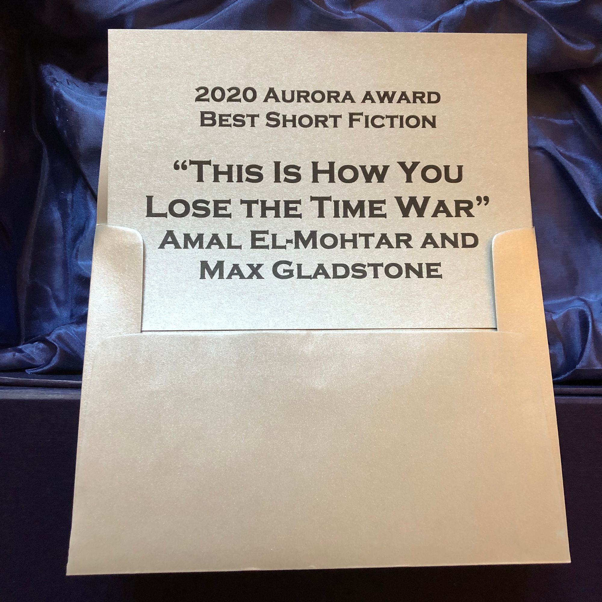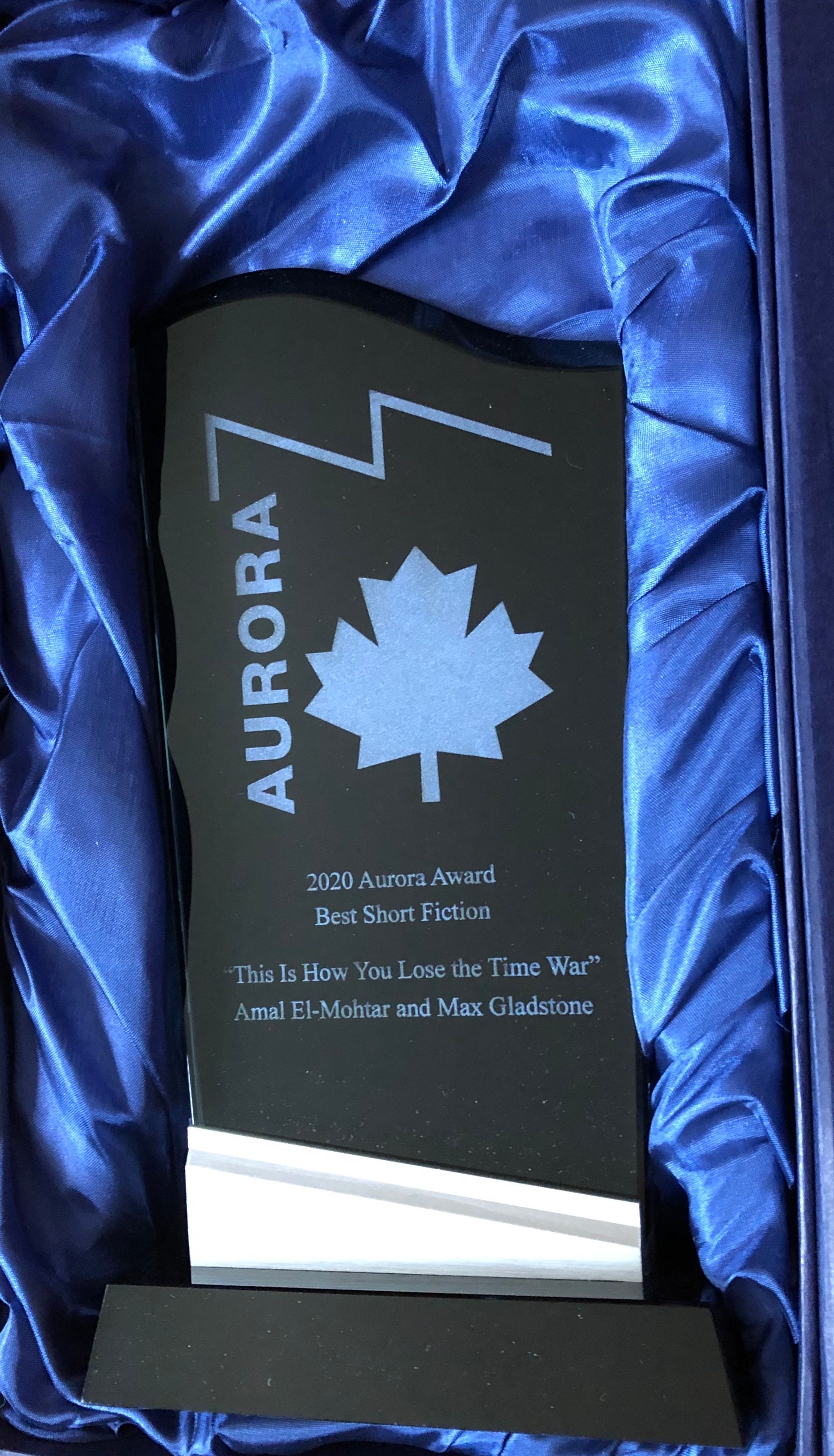 So, This Is How You Lose the Time War won the Aurora Award. It’s my first time winning a Canadian award, and has filled me with many many feelings, and I’m very glad they recognized and honoured Max too, despite this being ostensibly a Canadian award for Canadians, bringing me one tiny step closer to my master of plan of luring the Gladstone-Neely household across the 49th parallel to be my neighbours and friends forever.