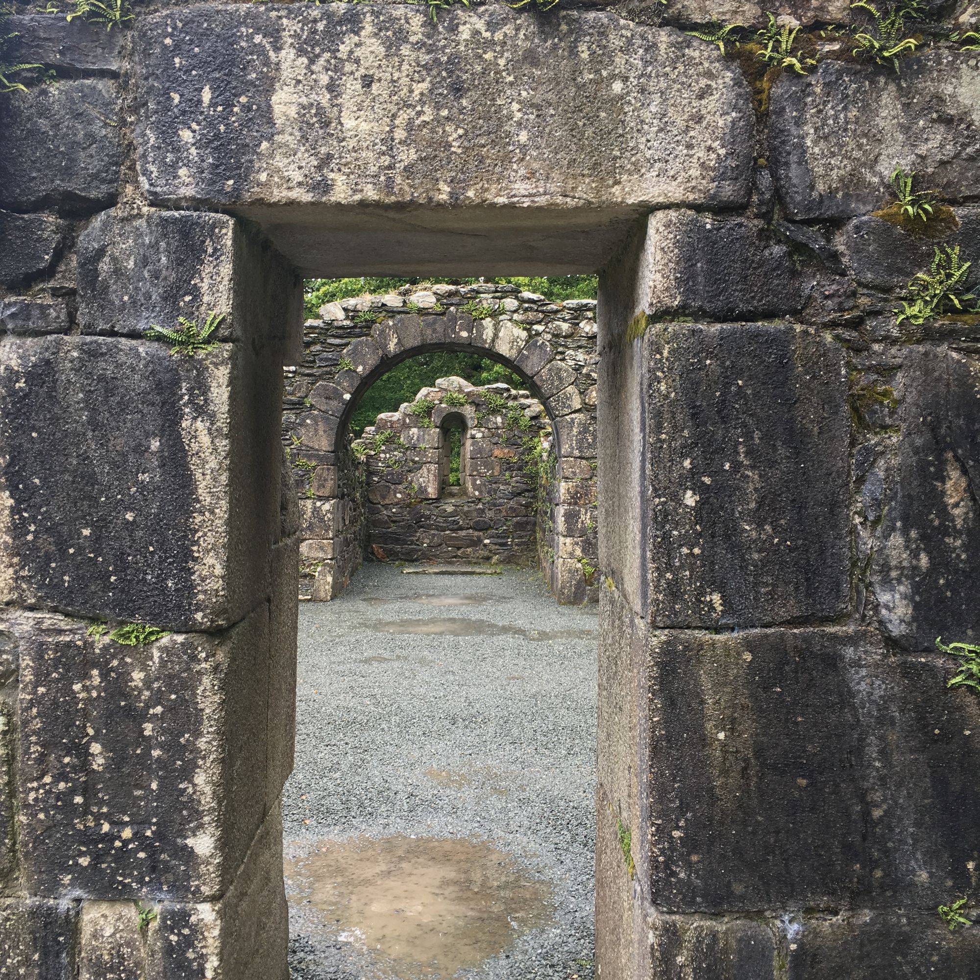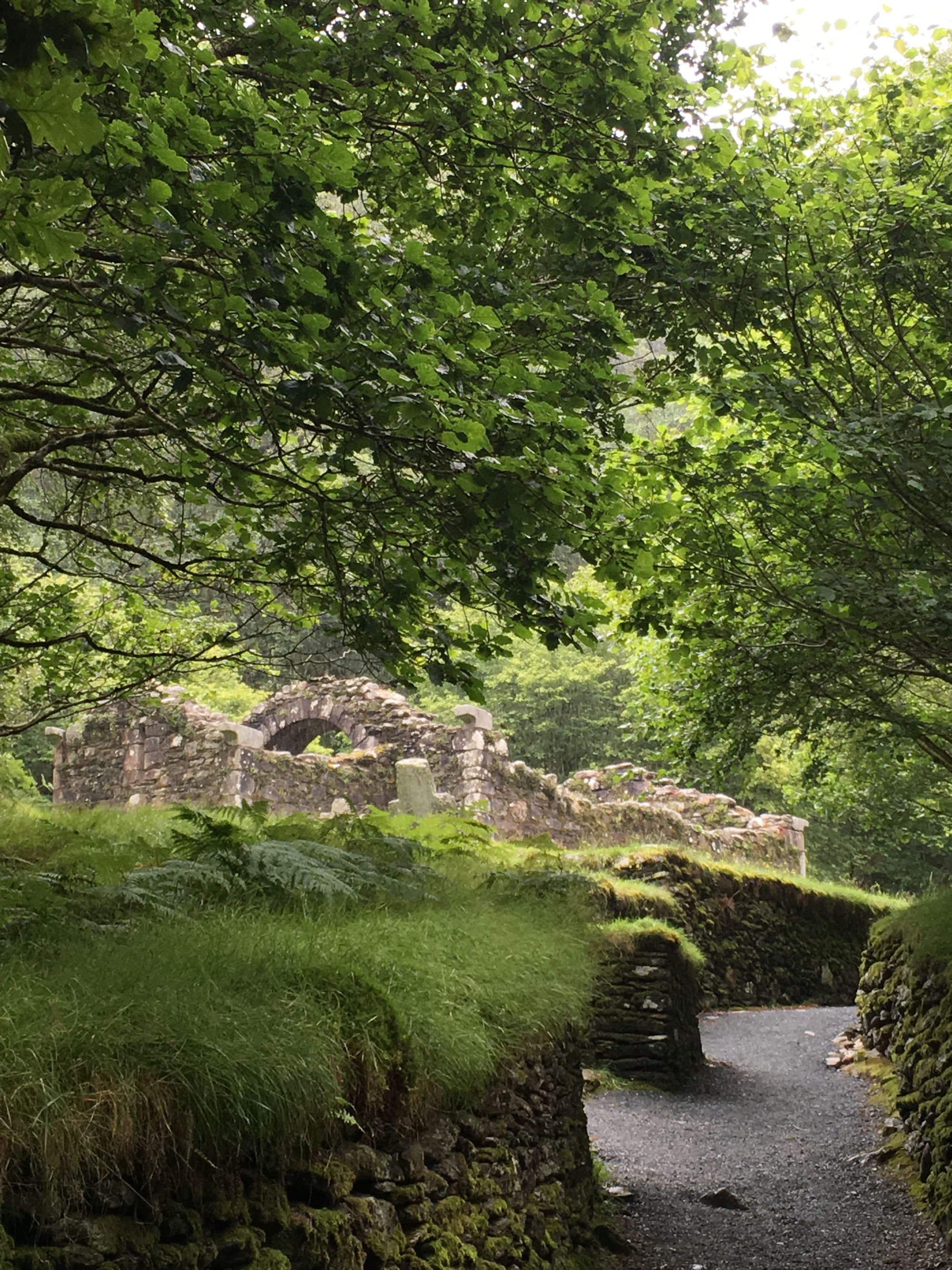 But it’s almost—oops, actually beyond—midnight where I am, and I’ve had a beautiful day, and I’ve chosen to write about stone and its age instead of the thousands of trees and flowers and vines I saw today, the green that claims the stone more eagerly even than human hands, tugs it back into landscape when it was built to be set against it. I want to tell you about how it began to rain so hard all around us but the trees we happened to be beneath sheltered us so thoroughly that we didn’t need our hoods, and the rain drummed on the lough while in the near distance the ruins of Reefert Church were veiled in rain and rushing, and for a few moments so long as I heard nothing but the rain and looked at nothing but wet green and old stone I felt my heart needled into release and relief.