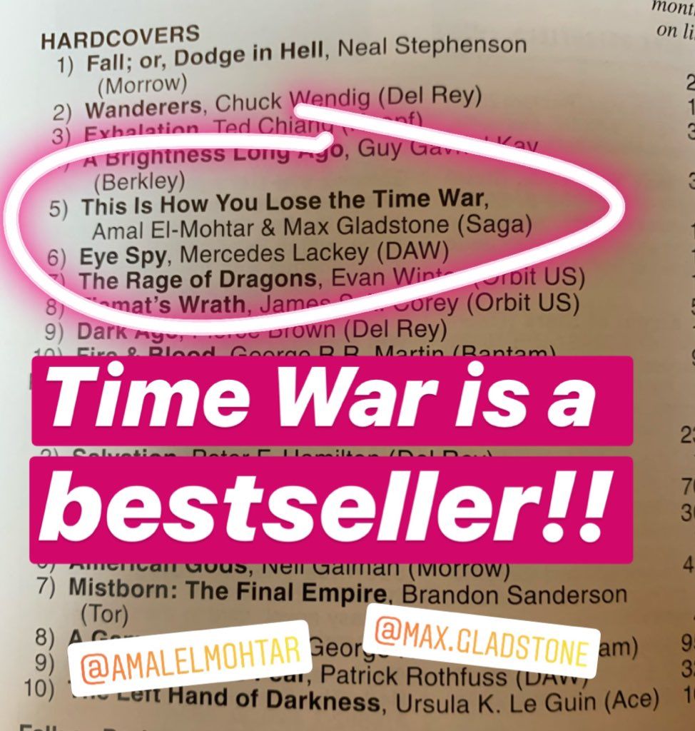 This Is How You Lose the Time War made it on to Locus Magazine’s hardcover bestsellers list in amazing company! I have no idea how these things are measured and reckoned but regardless Max and I are delighted and excited and grateful to everyone who bought copies. Speaking of which—