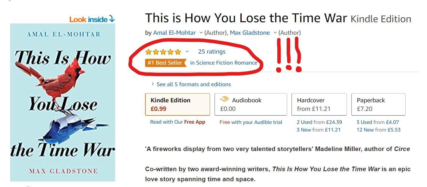 Friends! Just a quick swift note to tell you that This Is How You Lose the Time War is only 99p on Amazon UK’s Kindle! I learned this totally incidentally by seeing someone say so on Twitter so I don’t have any information about how long it’ll last — it’s either a Kindle Monthly situation or it’s part of a flash sale that’s on ‘til November 12? Either way I wanted you to know as soon as I did!